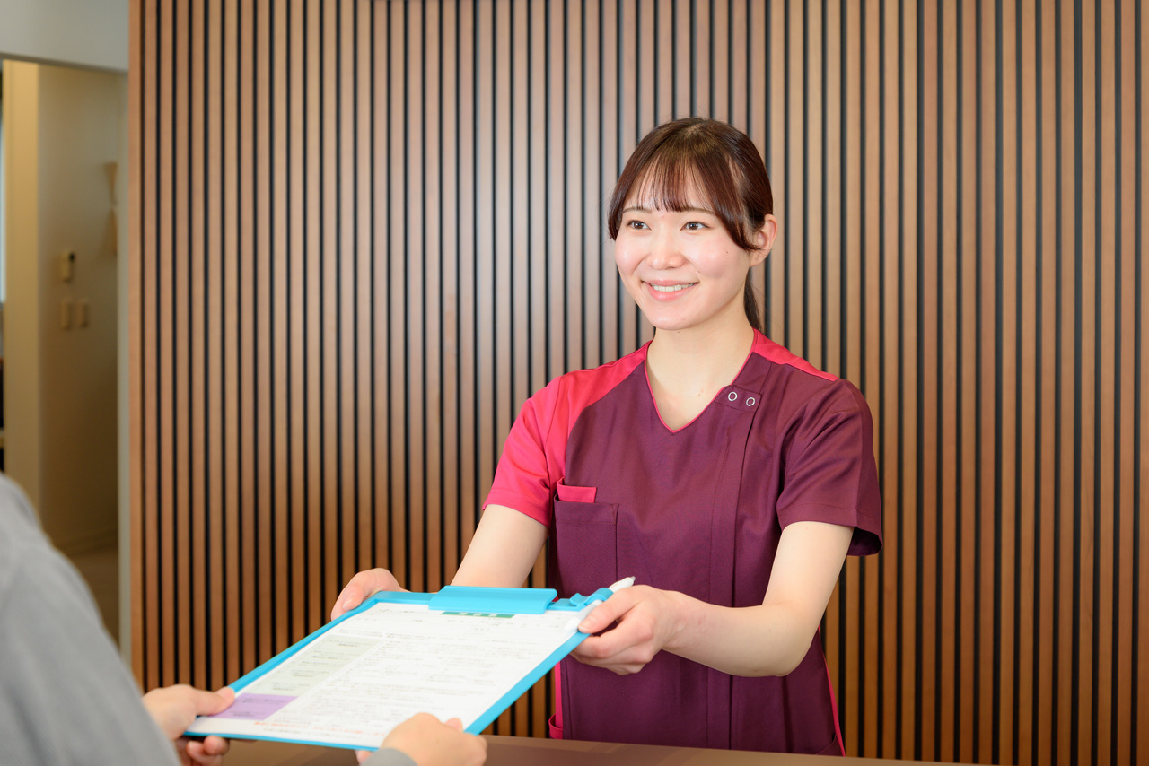 来院されましたら、まずは受付にお越しください。マイナンバーや診察券(再診の場合)のご提示、また必要に応じて問診票のご記入をお願いいたします。なお初診の方は、予約時間の15分前までにお越しいただけますとスムーズです。